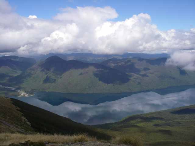 それでもその靴下を履いて、きつい上りを登った。急な道だったので登っている途中、“腰が折れるのでは??”という疑問を抱く。 でも、6日目ということもあり食料も減っていてバックパックは軽くなっていた。なので、何とか登りきる。登っている途中、雲の中も歩いて突き抜けた。 急な坂道が続く森を抜けて、下を見下ろしたら、鏡のように森と空を映し出しているLake Rotoroaが一望できて、ものすごく美しかった。